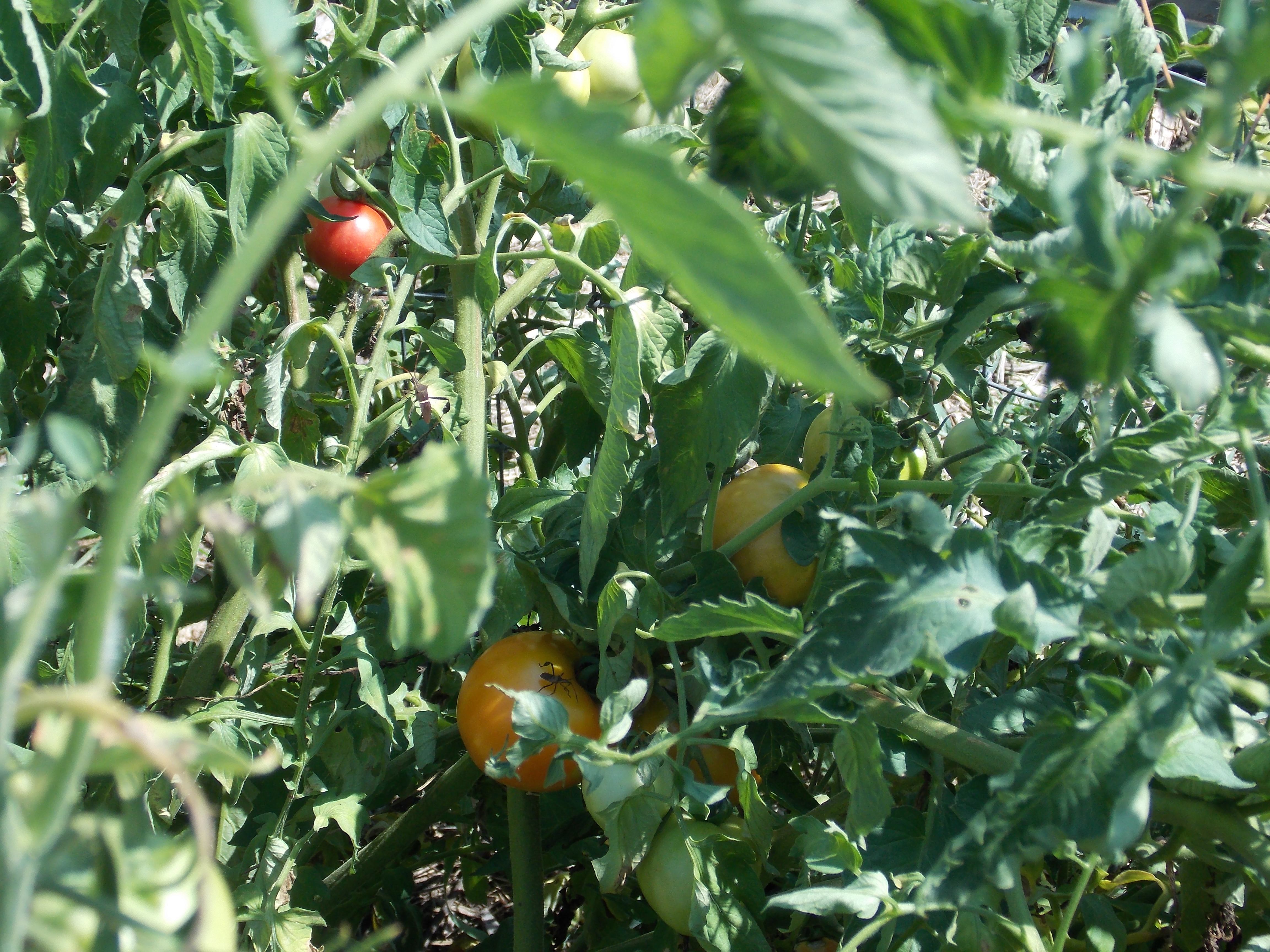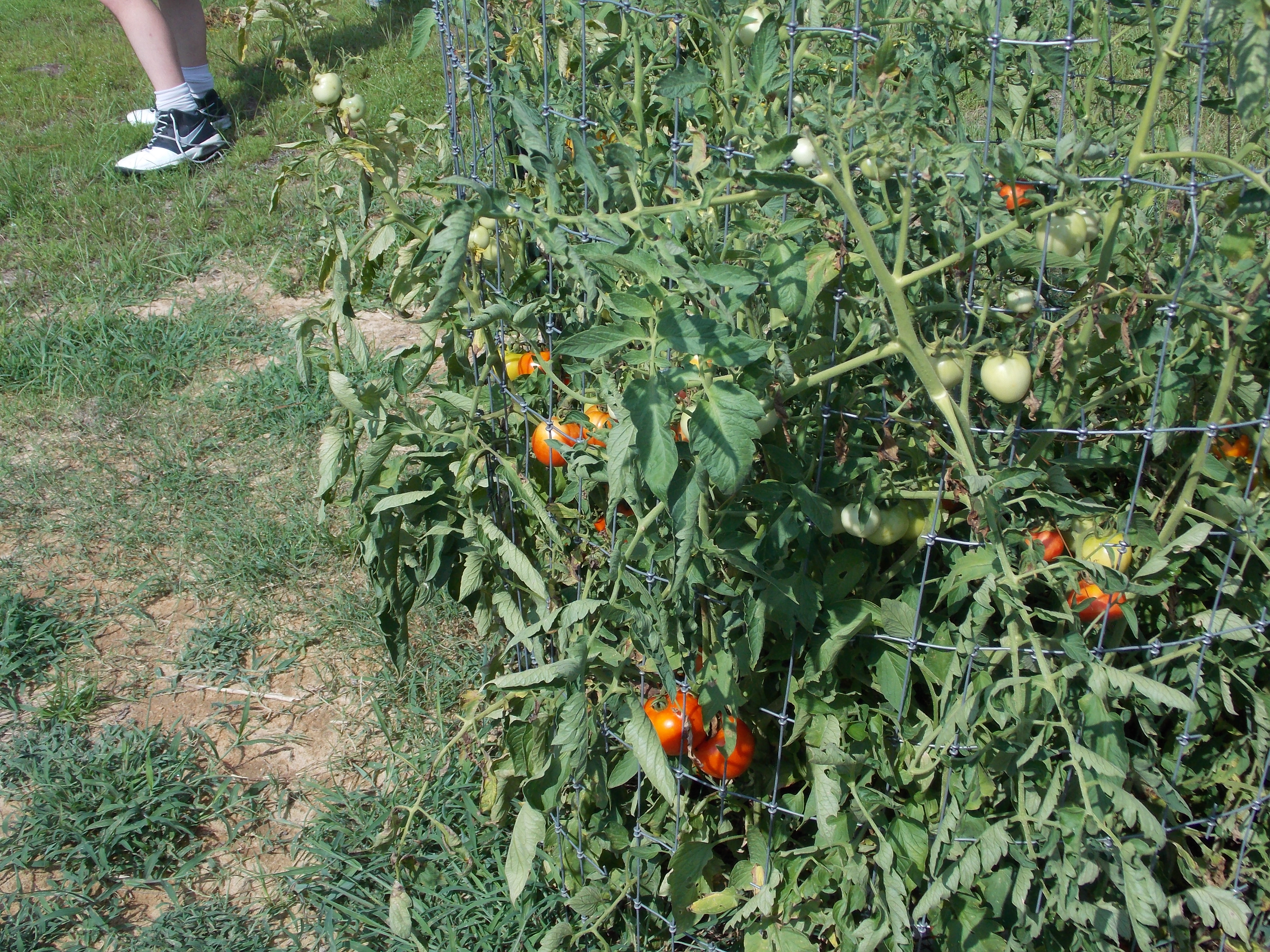 (as a last resort). Due to the nature of the cages and the proximity of the plants within guinea fowl would be virtually worthless in removing the pest. I say virtually because they would be useful in reducing the number of pest that make it to the planting thus reducing the damage to the fruit and plants, but would have been unable to remove pest directly from the interior of the planting because of a lack of access. Pest like the hornworm and the stinkbug did manage to find the plants however and gathering them manually to feed to our chickens was very difficult, again due in large part to the height of the cage and the density of the foliage. Hornworms were impossible to locate until reaching lengths of nearly three inches and causing serious foliage damage. Fortunately all of the plants were able to recover from the damage, but I am certain that it weakened the plant slowing growth and fruit production as well as making it further susceptible to other pest infestations. In spite of all the drawbacks the plantings have been producing a rather large amount of tomatoes.